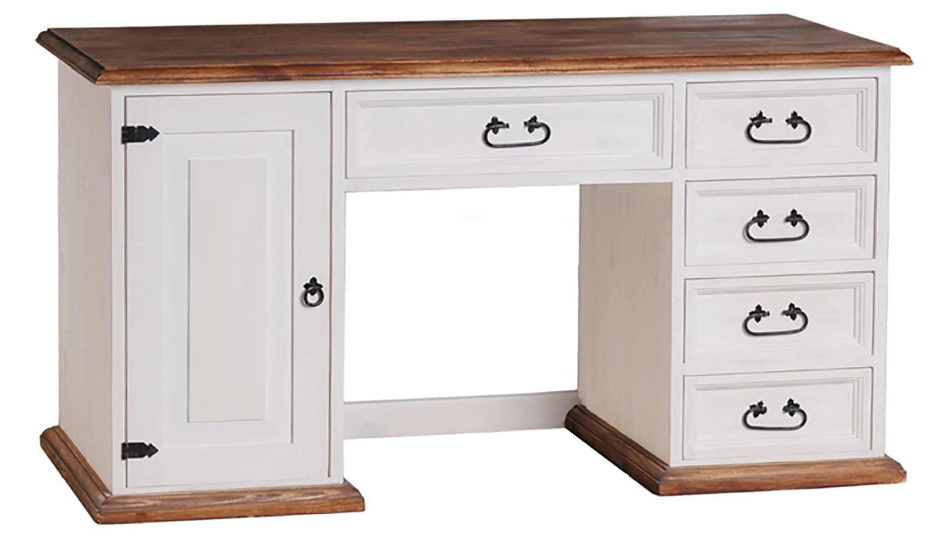 Tento písací stôl z masívu obsahuje 5 zásuviek,1 dvierka a dve police.
